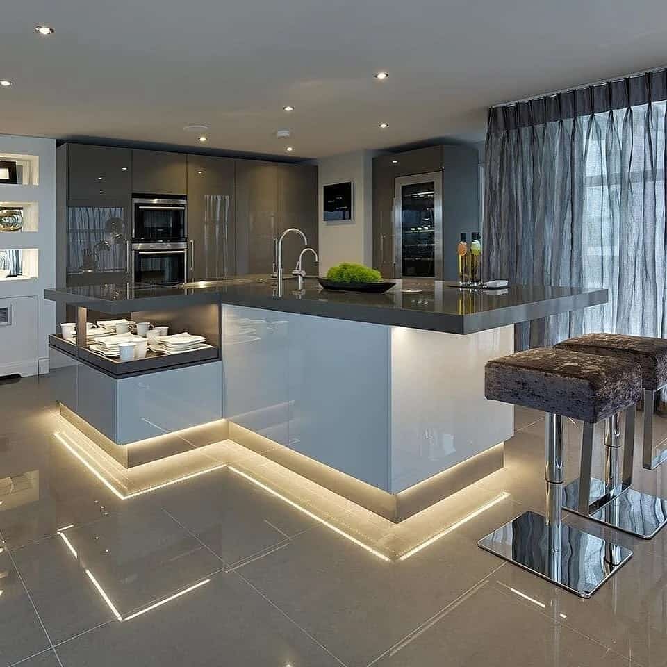 В них могут быть вмонтированы как цельные световые полосы, так и точечные лампы различных цветов. При желании такой плинтус можно сделать самому, проложив световую полосу в кабель-канал специальных плинтусов.