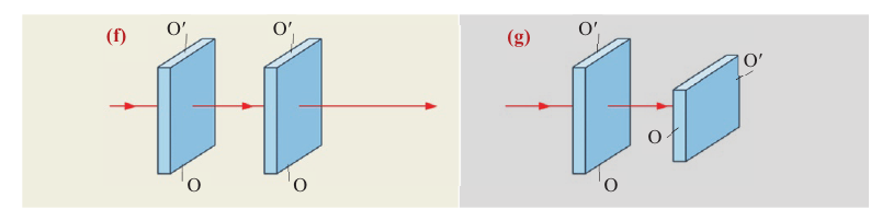 Становится понятно, что свет полностью проходит сквозь обе пластины, когда оси 00′ поляроида и анализатора параллельны (f). При изменениях угла между осями пластин в пределах наблюдается уменьшение интенсивности проходящего сквозь них света – частичное прохождение света. Но когда оси 00′ перпендикулярны друг другу, свет не проходит сквозь анализатор (g).