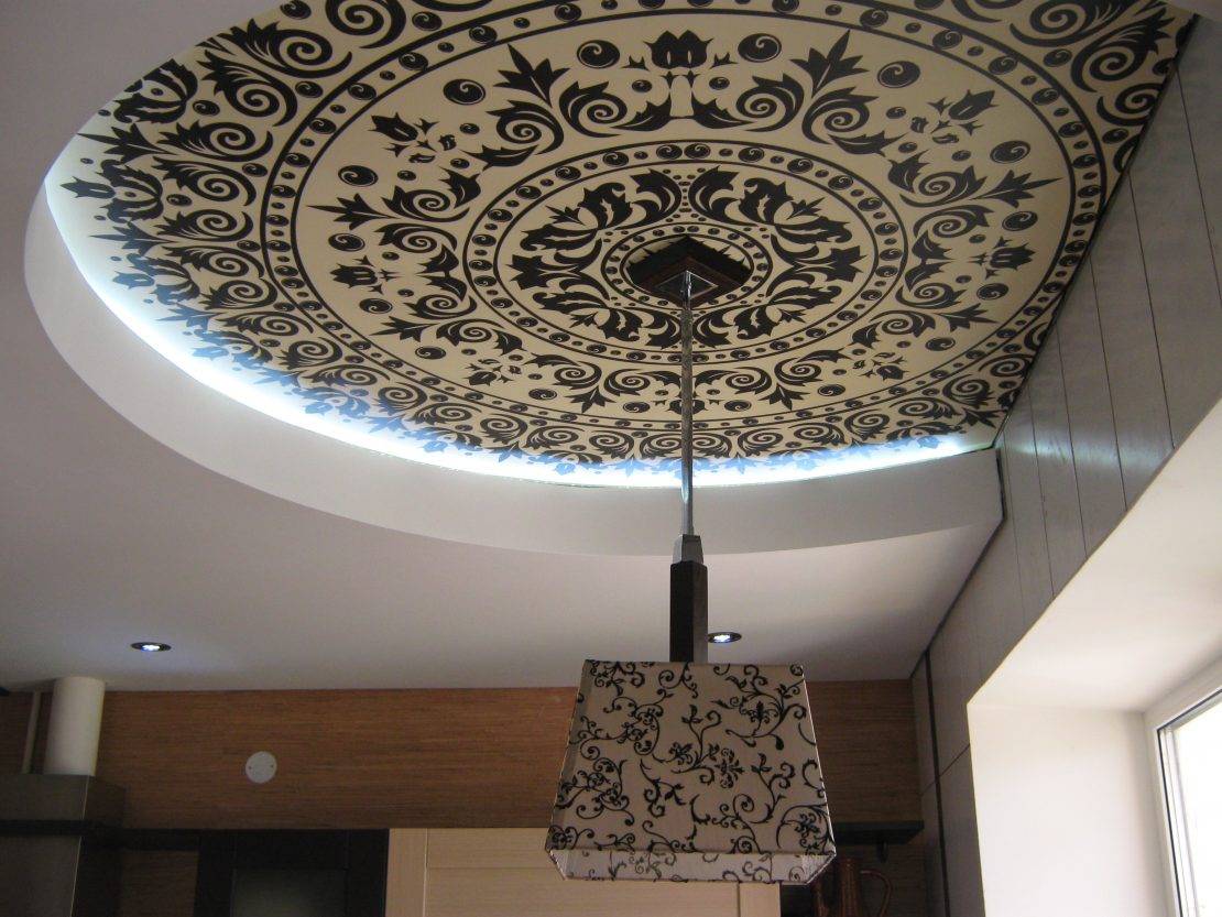 Этот элемент декора может занимать как небольшую область, ограниченную габаритами люстры, так и основную площадь всего потолка комнаты