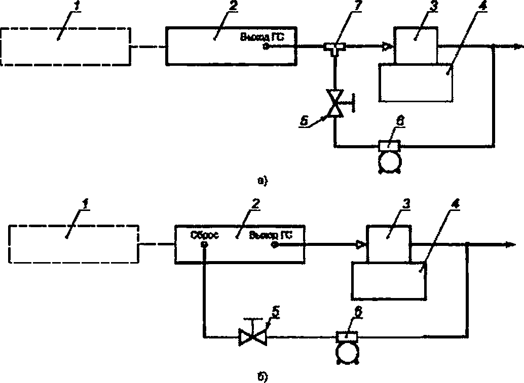 Рисунок Б.1 — Газовая схема для подачи ГС на газоанализаторы с принудительным отбором пробы (а — для генераторов или квлибрвторов без выхода сброса излишков ГС. б — для генераторов или калибраторов с выходом сброса излишков ГС)