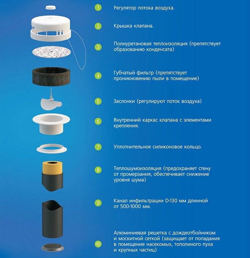 Существует два типа клапанов — для инфильтрации воздуха и для приточной вентиляции у них одна и та же — снабжение здания свежим воздухом