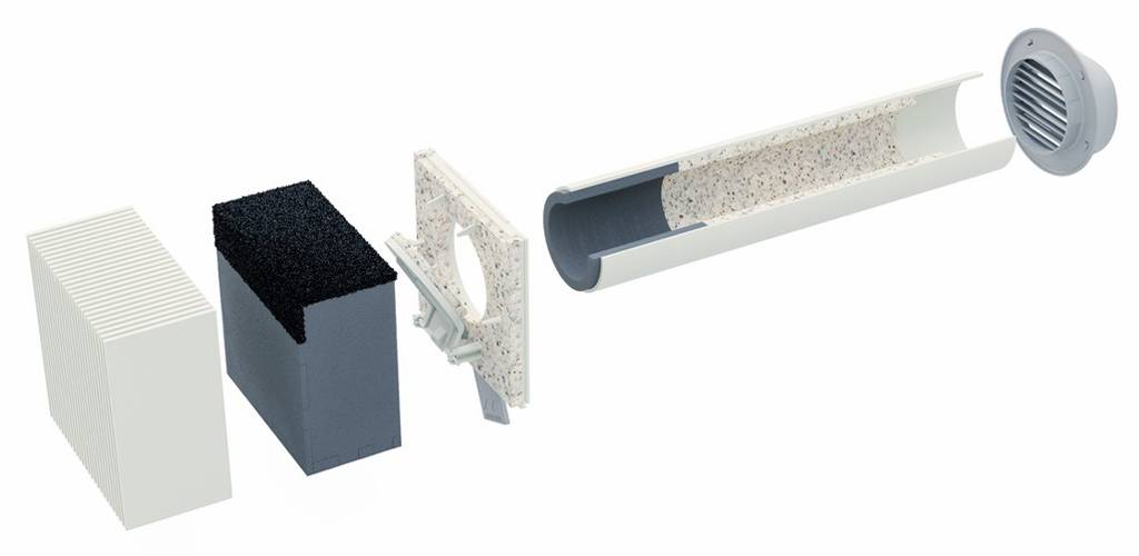 Цилиндр вставляется в просверленное отверстие в стене. Чтобы шум с улицы не проникал в дом, чтобы стены зимой не промерзали, между стеной и пластиковым цилиндром укладывается тепло- и шумоизоляционный материал. Обычно это цилиндрической формы изделие.