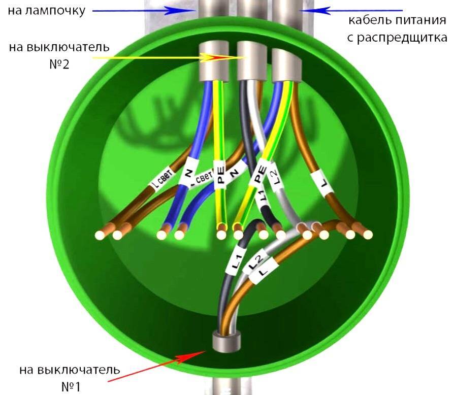 После выполнения рассмотренных выше шагов соедините второстепенные (отходящие) жилы с первым и вторым выключателем.
