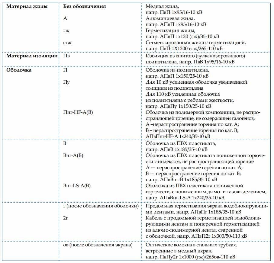 Таблица буквенной маркировки СПЭ-кабелей