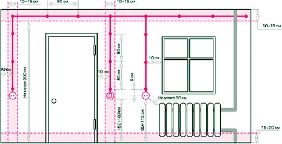Начало соединения проходит от распределительного щитка, при этом выключатели соединяются с лампой последовательно. Розетки располагаются перед выключателем. Наилучшее расстояние от пола 1 метр, такое же до потолка.