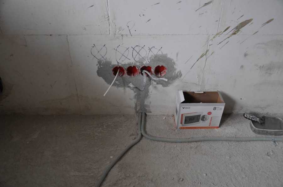 Коронкой по бетону на 70мм или 68мм (насадка на перфоратор), просверливаются отверстия для подрозетников. Штроборезом или болгаркой выпиливаются штробы для укладки кабеля. Штробы в стенах должны быть строго вертикальными, а не горизонтальными или по диагонали. Линии от розеток к щитку укладываются в стяжке пола или по потолку.