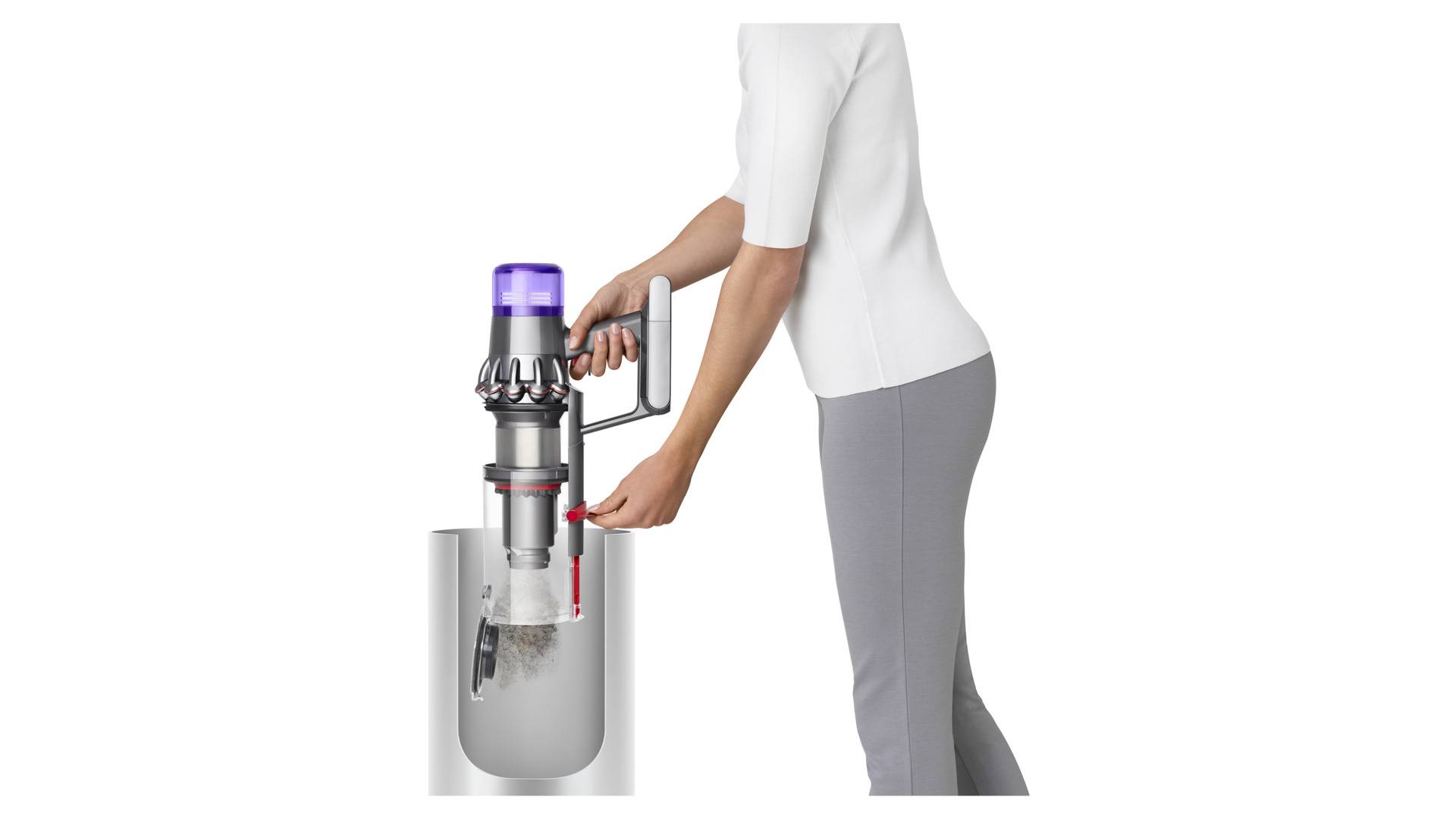 Если обычные пылесосы собирают мелкие частицы пыли с помощью фильтров, при этом засоряются и снижают мощность, то Dyson Cinetic не требует промывки или замены фильтров, которые при загрязнении снижают силу тяги в пылесосе. Новый уникальный механизм очистки мусорного контейнера позволяет вытолкнуть собравшуюся пыль нажатием одной кнопки без каких-либо дополнительных действий.