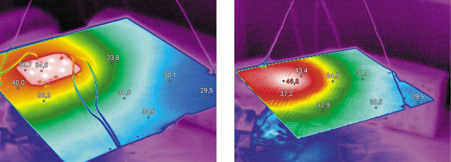 Причина неэффективности добавочной площади видна, если сравнить термограммы радиаторов с 18 см2 обтянутой площади на 1 Вт мощности (рис. 7) и алюминиевой пластины 300×300×1,5 мм с тем же светодиодным модулем (рис. 8), что соответствует 78 см2 на 1 Вт мощности.