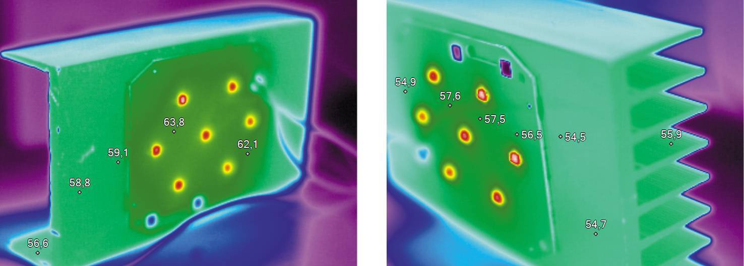 Четырехкратное увеличение обтянутой площади практически не привело к снижению температуры платы из-за возникающей неоднородности температуры и неэффективности крайних участков радиаторной площади.