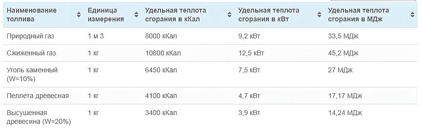 | Наименование толпива | Единица измерения | Удельная теплота сгорания в кКал | Удельная теплота сгорания в кВт | Удельная теплота сгорания в МДж |