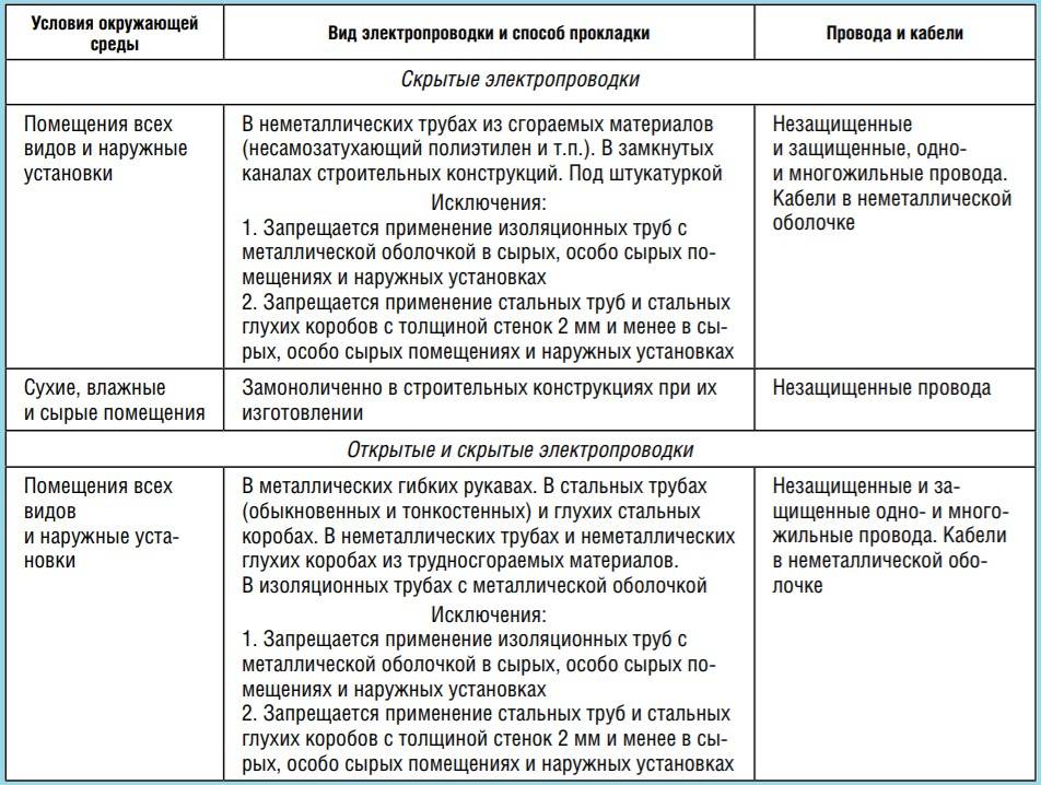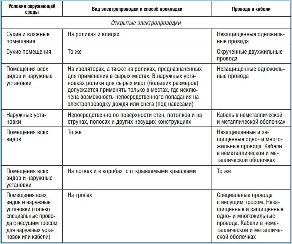 Рис. 3 Критерии выбора и способы прокладки открытых электрических проводов и кабелей