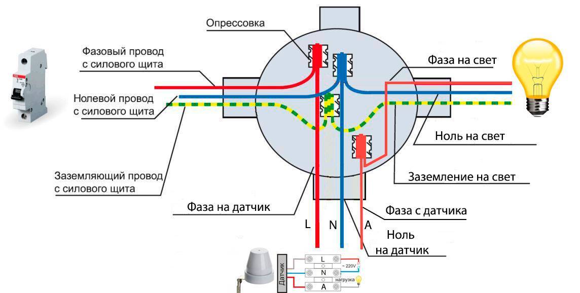 Схема подключения датчика света такова. Проводите питающую фазу к датчику, а через него уже продолжение к светильнику, при этом лучше, чтобы светильник и датчик были на раздельном контуре, нежели на общем освещении. Процесс монтажа довольно-таки прост, заведите трёхжильный кабель от автомата в щитке в распределительную коробку, жилы маркируйте для удобства (земля, ноль, фаза).