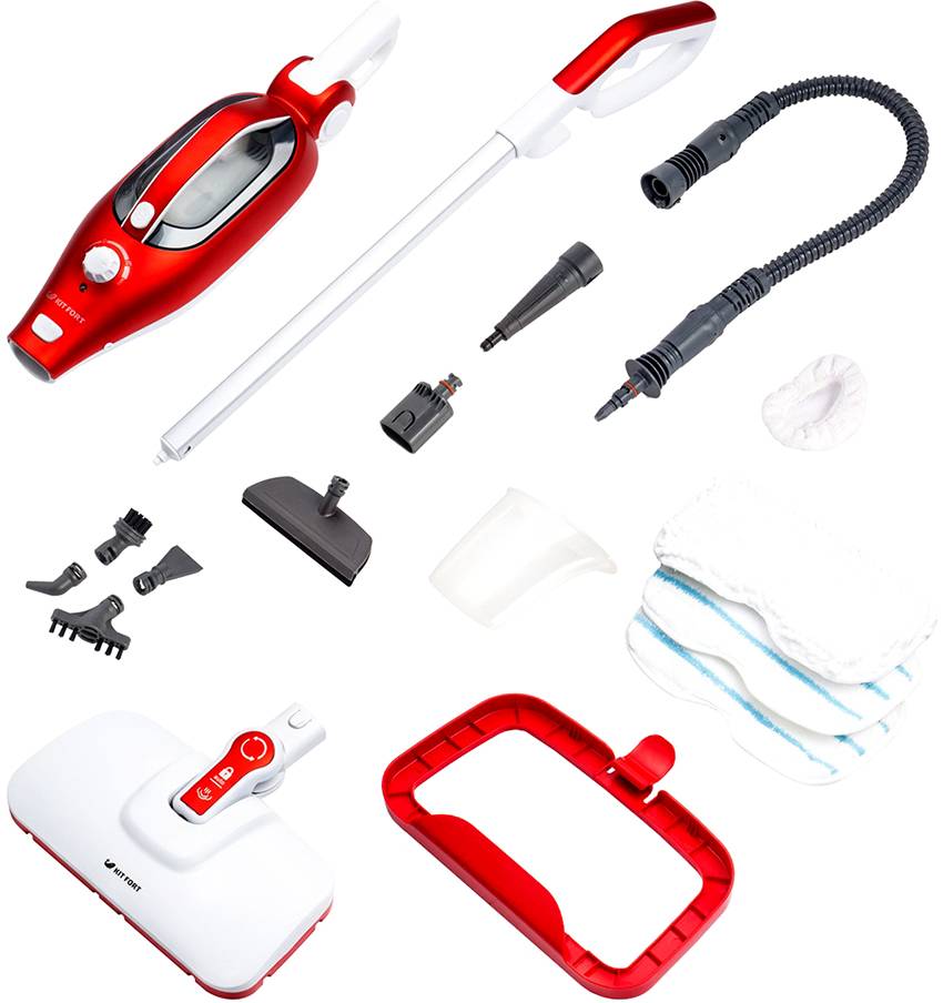Легкий и функциональный пылесос-швабра продается по демократичной цене от 2500 руб. Оборудован большой треугольной напольной насадкой, установленной на шарнирном механизме. За счет этого паровая швабра очень маневренная, может залезать в узкие места (под кровать и т.д.). Нагревает воду за 30 секунд и выдает горячий пар (130°C) под давлением 1 бар. Хорошо убирает загрязнения даже без моющих средств.