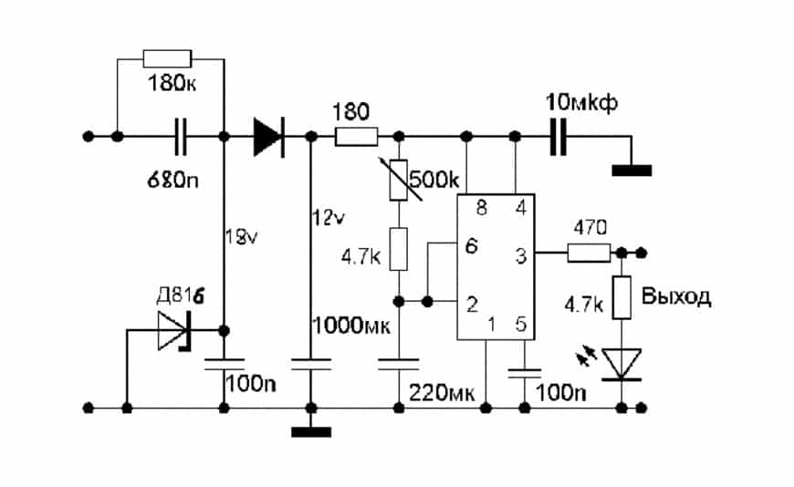 Как видите на схеме, таймер выполняет роль управляющего ключа, разрешающего выдачу электрического сигнала либо напрямую к прибору, либо через оперирующий орган – катушку реле. Когда времязадающая цепочка из двух резисторов и конденсатора достигнет насыщения, таймер выдаст на выход реле времени управляющий сигнал, который притянет к катушке прибора сердечник и замкнет контакты. К выходной катушке параллельно подключается светодиод, сигнализирующий о состоянии реле.