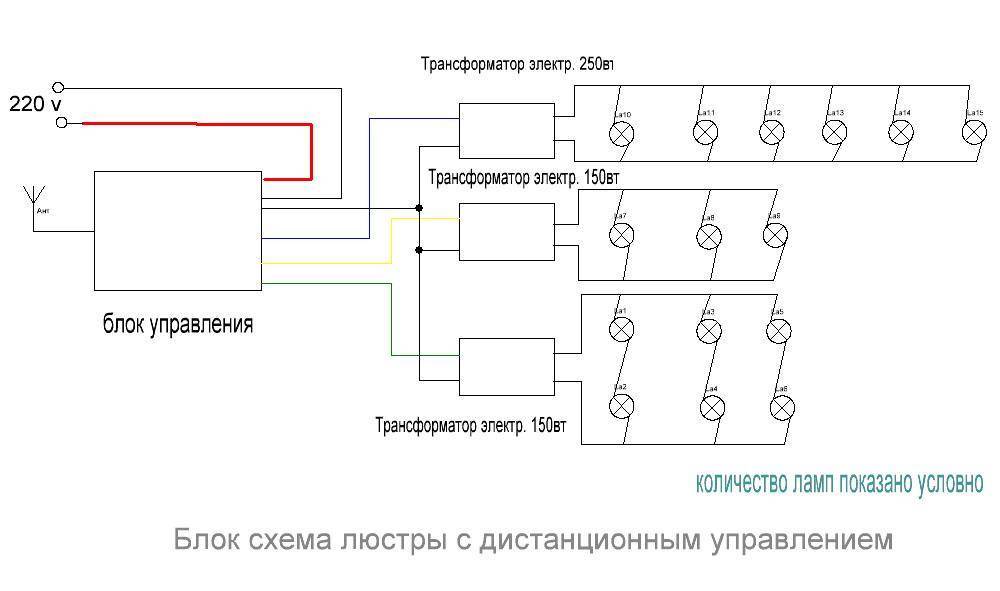 Люстра с дистанционным управлением имеет более сложную блок-схему, чем обычный осветительный прибор
