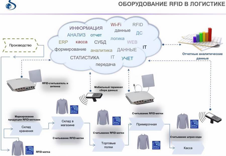- RFID-метка – маленький чип, хранящий и пересылающий сведения;