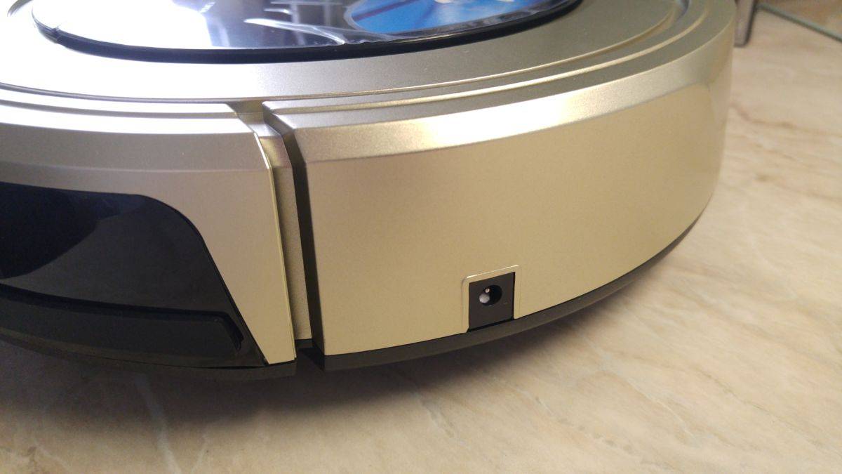 На правой грани имеется включатель, защищенный прозрачным бампером, на левой — разъем питания, который пригодится, если потребуется зарядить робот напрямую от адаптера 220 В. На тыльной стороне размещен воздуховод для выброса всасываемого с пола воздуха. На передней грани — подпружиненный бампер с резиновой накладкой и затемненным стеклом для инфракрасных датчиков.