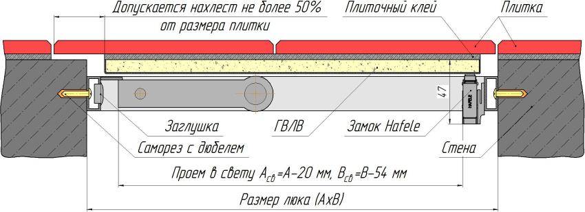 При самостоятельном изготовлении, габариты люка должны быть равными размерам плитки, используемой в облицовке помещения, что позволяет максимально качественно замаскировать ревизионное отверстие.