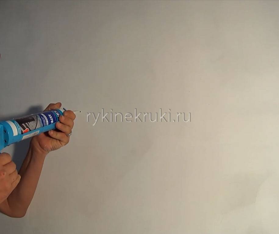 Заделать такое отверстие можно акриловым герметиком. Герметик должен быть именно акриловый, а не силиконовый. Ведь акриловый герметик легко окрашивается, а силиконовый — нет. Итак, берем пистолет и начинаем тщательно набивать наше отверстие акрилом: