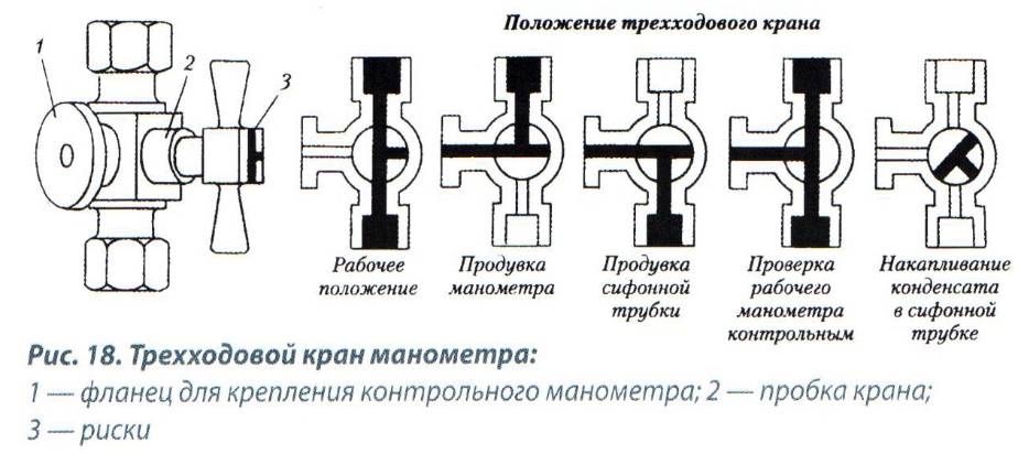 В корпусе трехходового крана под манометр предусмотрено наличие сливного отверстия, а также запорный элемент с Т-образным каналом. Поворот рычага управления краном позволяет в рабочем режиме направить поток рабочей среды в нужное направление.