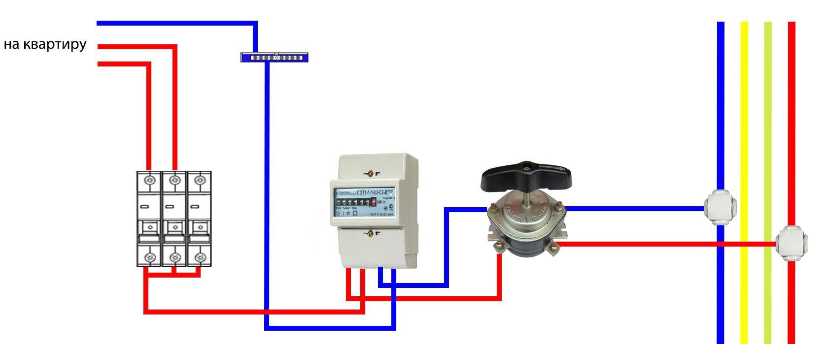 Далее с пакетника напряжение поступает на электросчетчик. После прибора учета, ноль идет на зажимную колодку, а фаза через автомат на вашу квартиру. Там уже стоит отдельный распредщиток.