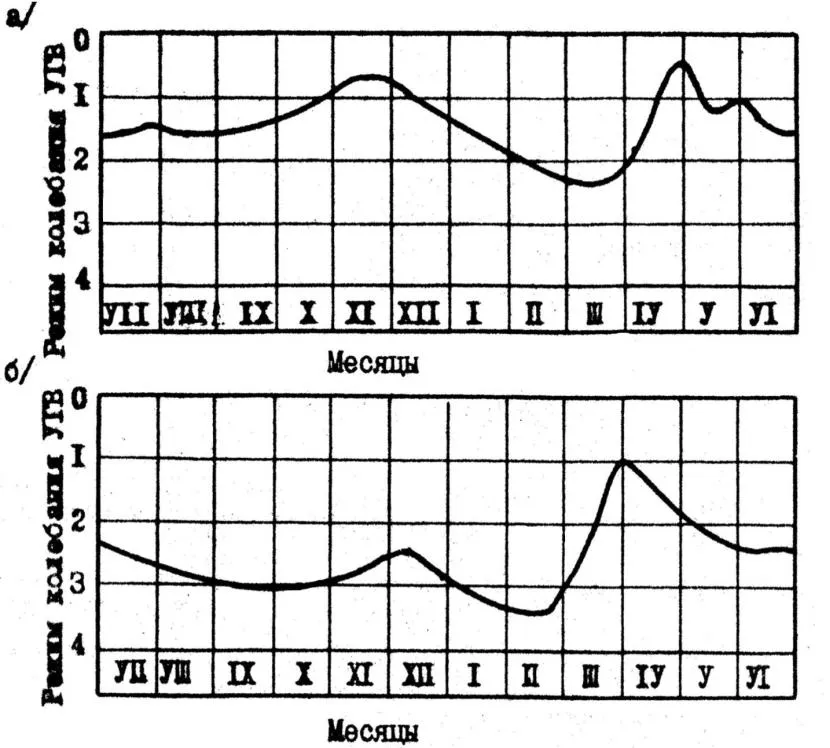 График изменения УГВ по месяцам в разные годы в зависимости от погодных условий Источник konspekta.net