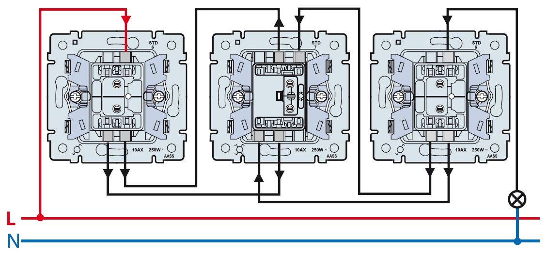 Схема подключения проходного выключателя с 3х мест