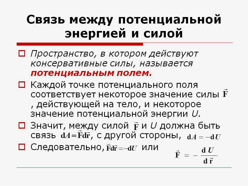 Установлена связь между консервативной силой, которая вызывает потенциальную энергию всех взаимодействующих между собой тел, и этой энергией.