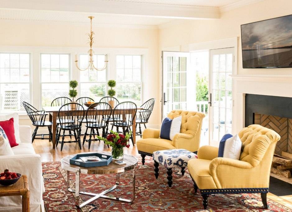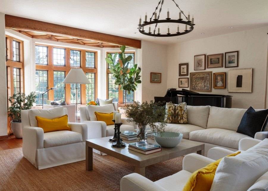 Для полноценного освещения люстру совмещают с точечными светильниками, бра, настольными и напольными торшерами, которые размещают в отдельных зонах. Например, для чтения, над столом для приёма гостей и т. п. Точечные светильники встраивают в потолок. Все приборы желательно подбирать в схожем стиле, но не обязательно из одной коллекции.