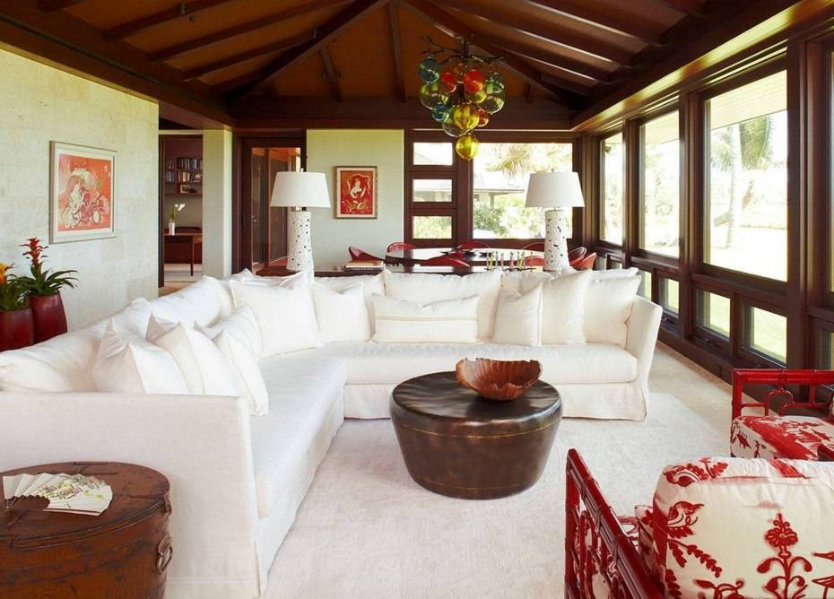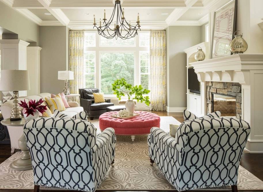 Красивая люстра в гостиной может стать акцентирующим элементом дизайна. В этом случае ее должен выделять или яркий цвет, или какой-то особенный оттенок, отсутствующий в других деталях интерьера.