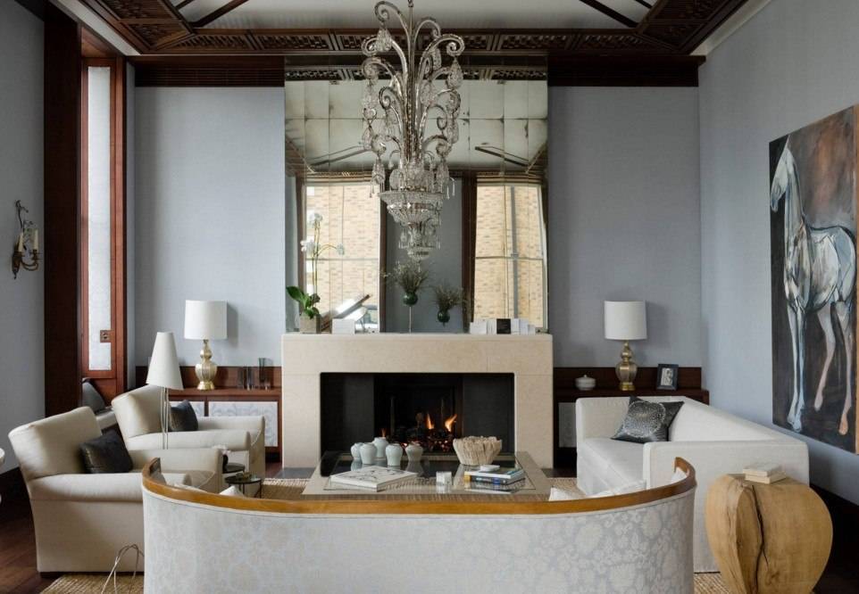Одним из вариантов оформления светильника в гостиной может стать применение зеркал. При таком выборе к лучшему изменится не только эстетика помещения, но и возрастет уровень освещенности.