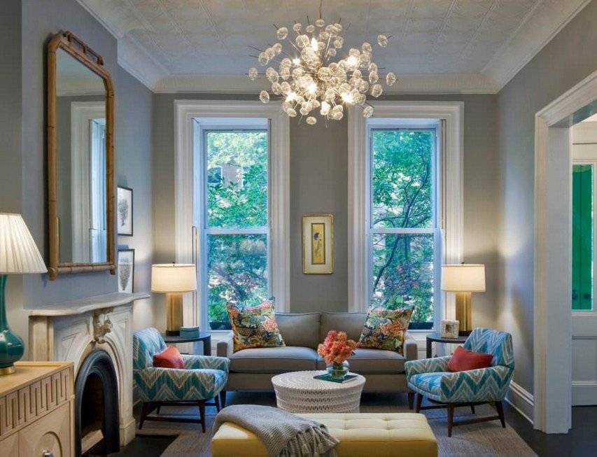 На фото подвесная люстра, размещенная по центру потолка в интерьере небольшой гостиной.