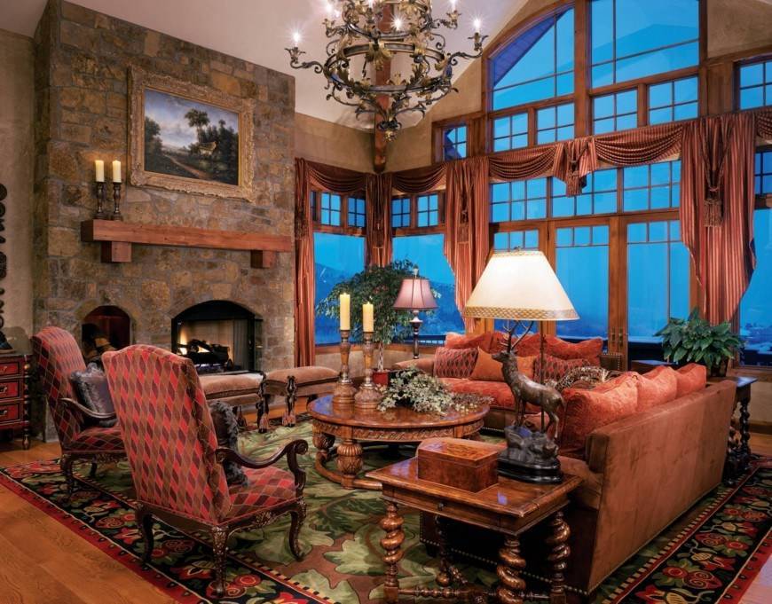При наличии камина выбор источника света в гостиной должен определяться его стилем. В частности, хорошим дополнением к классическому камину станут стилизованные кованые канделябры.