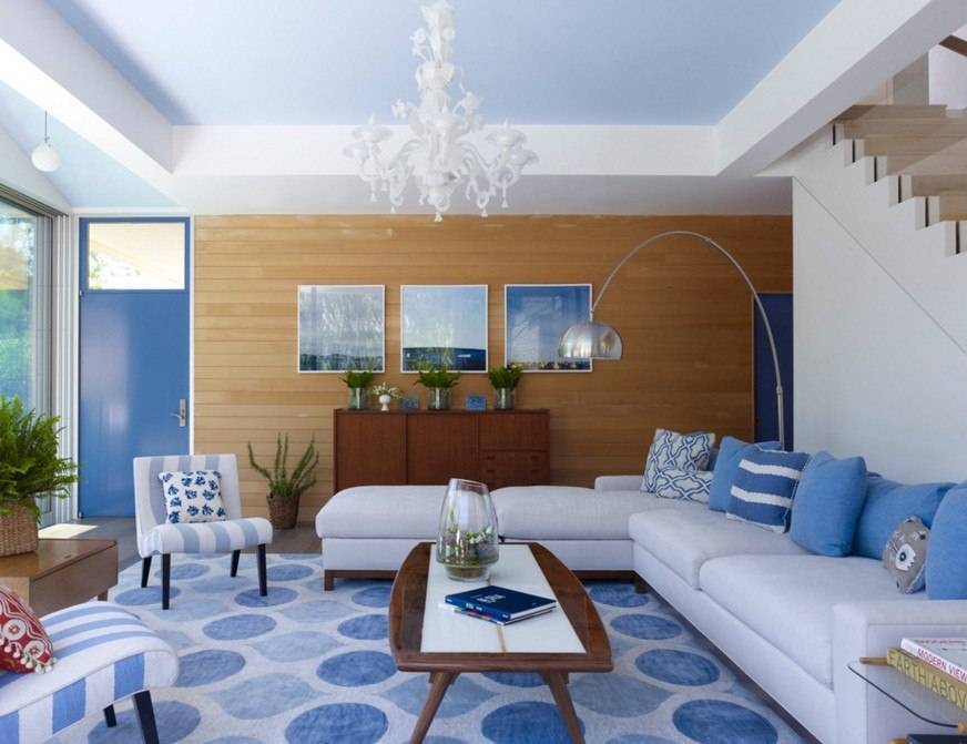 Если гостиная имеет значительные размеры, то в помещении с помощью нескольких потолочных светильников можно разграничить различные зоны.