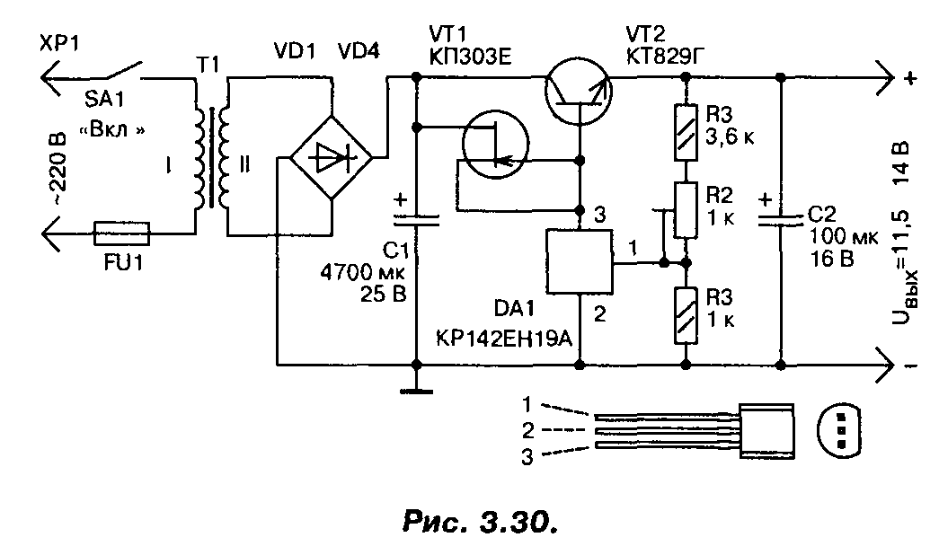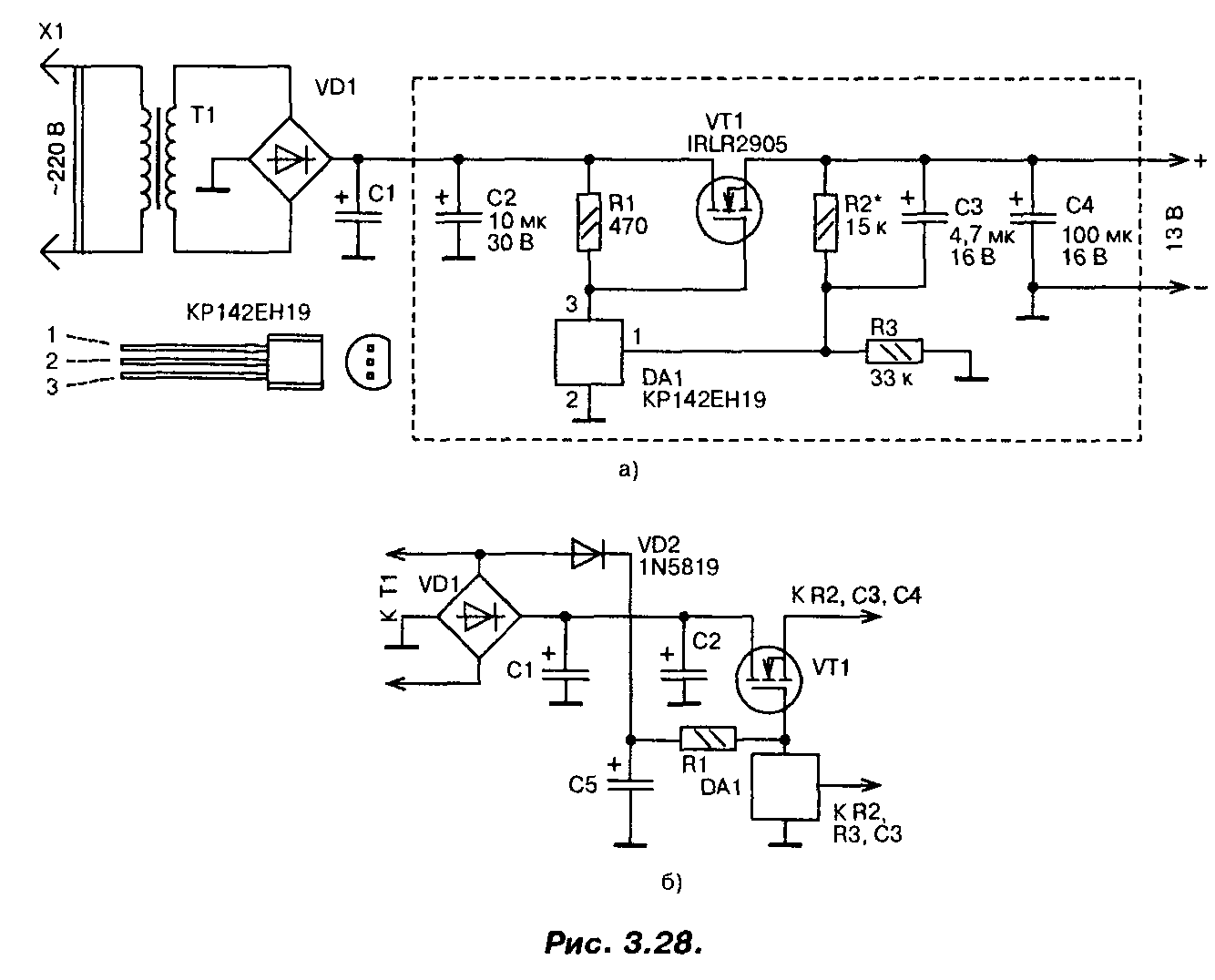 Схема одного из вариантов такого стабилизатора приведена на рис. 3.28.0. Со вторичной обмотки трансформатора переменное напряжение около 13 В (эффективное значение) поступает на выпрямитель и сглаживающий фильтр. На конденсаторах фильтра оно равно 16 В. Это напряжение поступает на сток мощного транзистора VT1 и через резистор R1 на затвор, открывая транзистор.