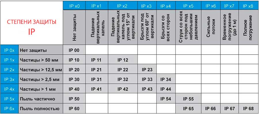 Возле буквенного обозначения IP ставится две цифры. Первая показывает пыле-, а вторая влагозащищенность.