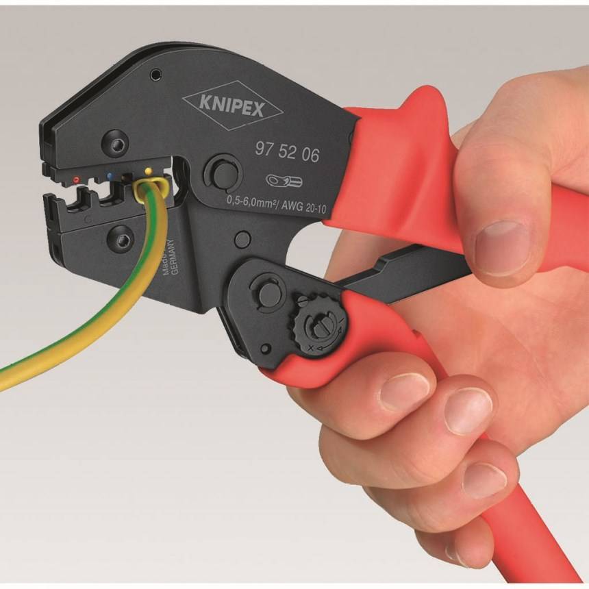 Однако с профессиональными инструментами картина совершенно иная. Например, кримпер KNIPEX KN-975304. В нем диапазон обжимаемых сечений существенно выше. Он составляет уже 0,08÷10 кв.мм. И это, в принципе, позволяет работать даже с контактными гильзами.