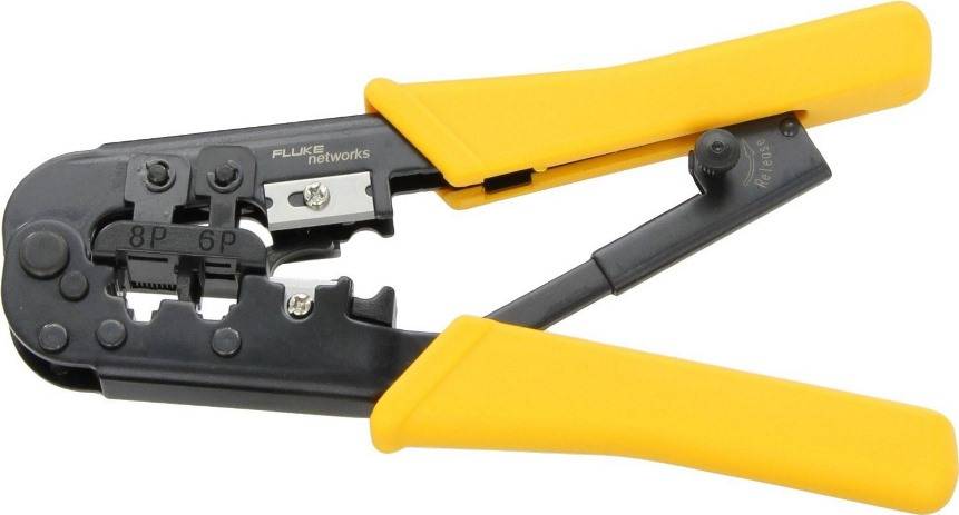 Для обжимки применяются крипперы. В идеальном варианте в одном приспособлении совмещаются оба. Губки с лезвием данного инструмента аккуратно подрезают изоляцию, давая возможность снять её с кабеля. Кроме того, имеются специальные отверстия для коннекторов различных типов, которые позволяют произвести качественную обжимку. Поэтому монтер, который наизусть знает, как правильно расположить жилы кабеля в коннекторе, с помощью такого инструмента работу ведёт в разы быстрее и качественнее.