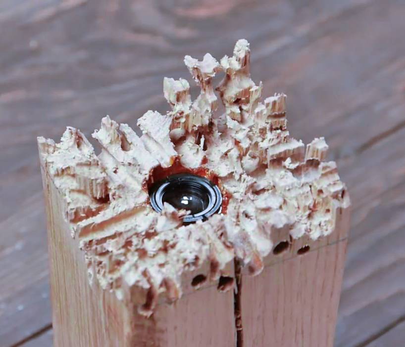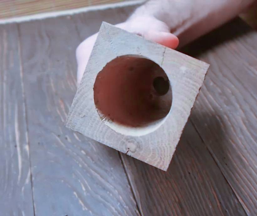 Высверливание отверстий по сторонам бруска. На одной стороне основы используем сверло, соответствующее диаметру барьера, для просверливания другого конца берем перьевое сверло большого диаметра (до 5 см). Чтобы облегчить работу, предварительно целесообразно просверлить несколько дополнительных отверстий при помощи обычных сверл.