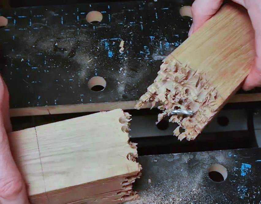 две параллельные линии по ширине основы. Затем поверх одной из них наносим от руки произвольную дугообразную линию. - Разделение основы по разметке. Чтобы разломать кусок дерева, молоток и стамеска не пригодятся. Для этого мы используем дрель и несколько сверл, имеющих разный диаметр. Сверление производим в хаотичном порядке, но в целом ориентируясь на намеченную дуговидную линию. Далее при помощи стамески разделяем деревянный брус на две части.