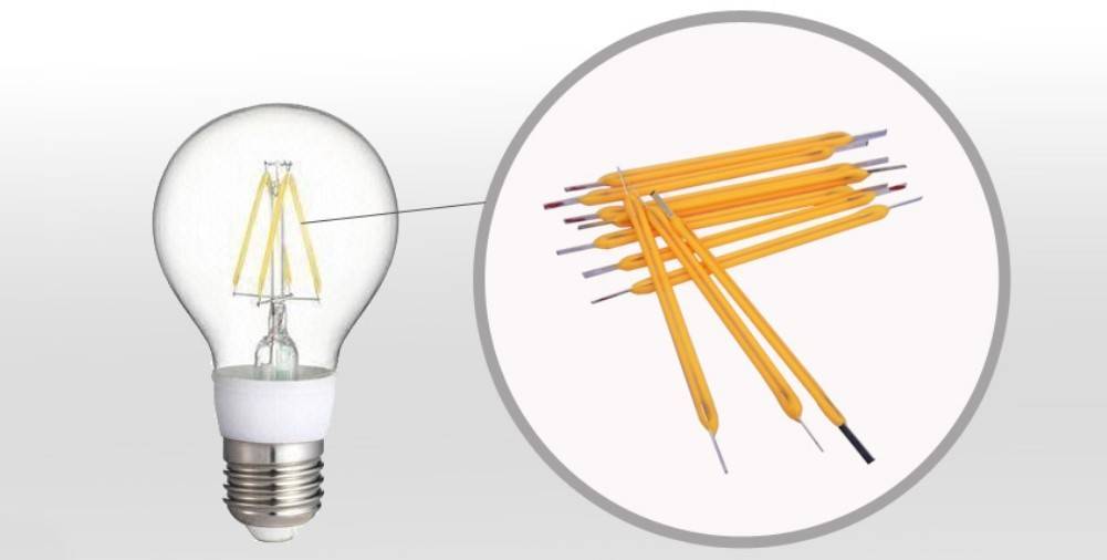 Светодиоды Filament – это наклеенные на стеклянные полоски кристаллы. С обеих сторон полосы металлизируют. Корпус конструкции – стеклянная колба, как в лампе накаливания. Внутри находится гелий, он используется для охлаждения. Используются при производстве светотехнического оборудования, их недостаток – менее долгий срок службы, чем у SMD.