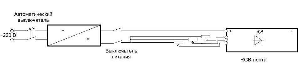 В этом варианте светильник будет излучать свет, близкий к белому. С экономической точки зрения смысла в этом нет – лента с белым цветом излучения стоит намного дешевле. Другой вариант – подключить цветную ленту для раздельной ручной регулировки каналов. Это можно сделать с помощью потенциометров или другим способом.