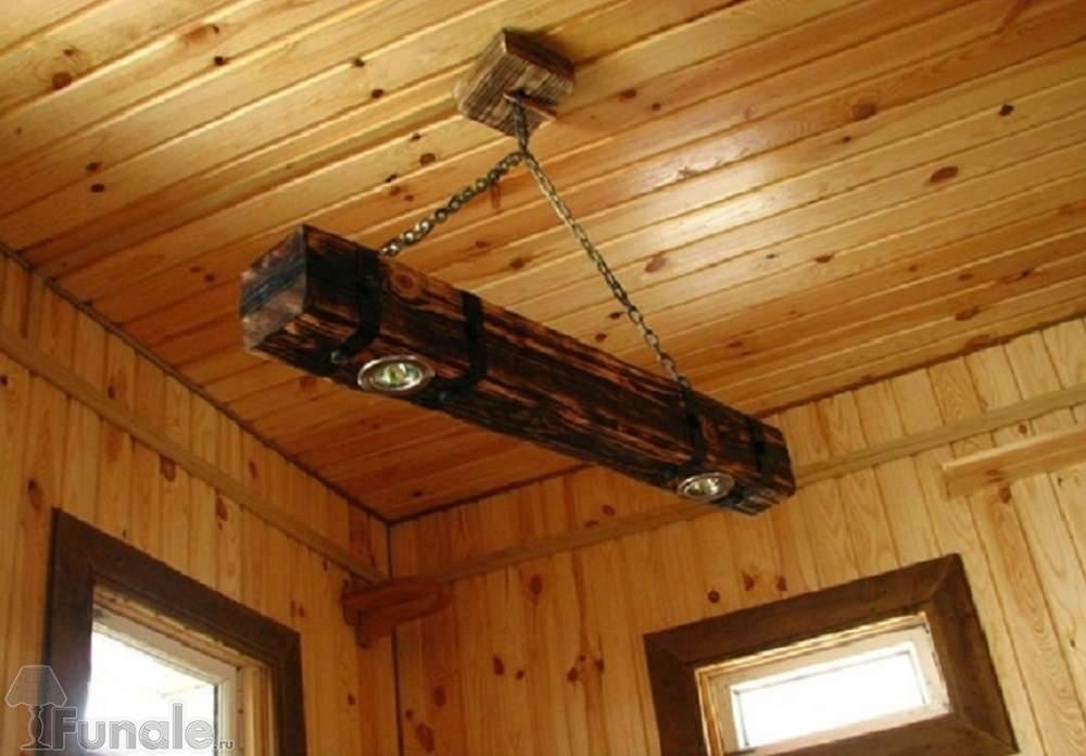 Если же не стремиться имитировать старину, можно купить или самостоятельно изготовить такой вариант: метровая где-то балка из дерева с вмонтированными в ряд источниками света, подвешенная либо на цепях, либо на тросиках. А также интересны более сложные конструкции из подобных балок – например, соединение их в треугольник или иную фигуру.