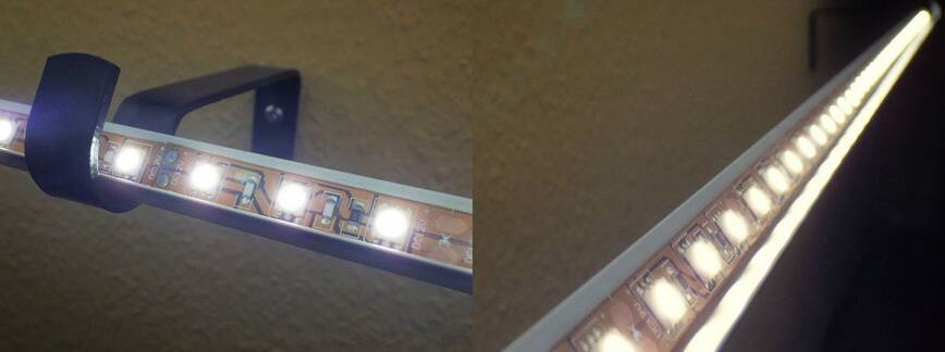 Перед поклейкой, необходимо убедиться, что светодиодная лента изолирована от алюминия. Это необходимо для того чтобы избежать короткого замыкания. Затем нужно прикрепить ленты к двум алюминиевым профилям и припаять между ними соединительную пару проводов. После того, как осветительная лента была установлена в профиль, ее необходимо протестировать. Освещение может включаться совместно с общим светом или ее можно сделать с отдельным выключателем.