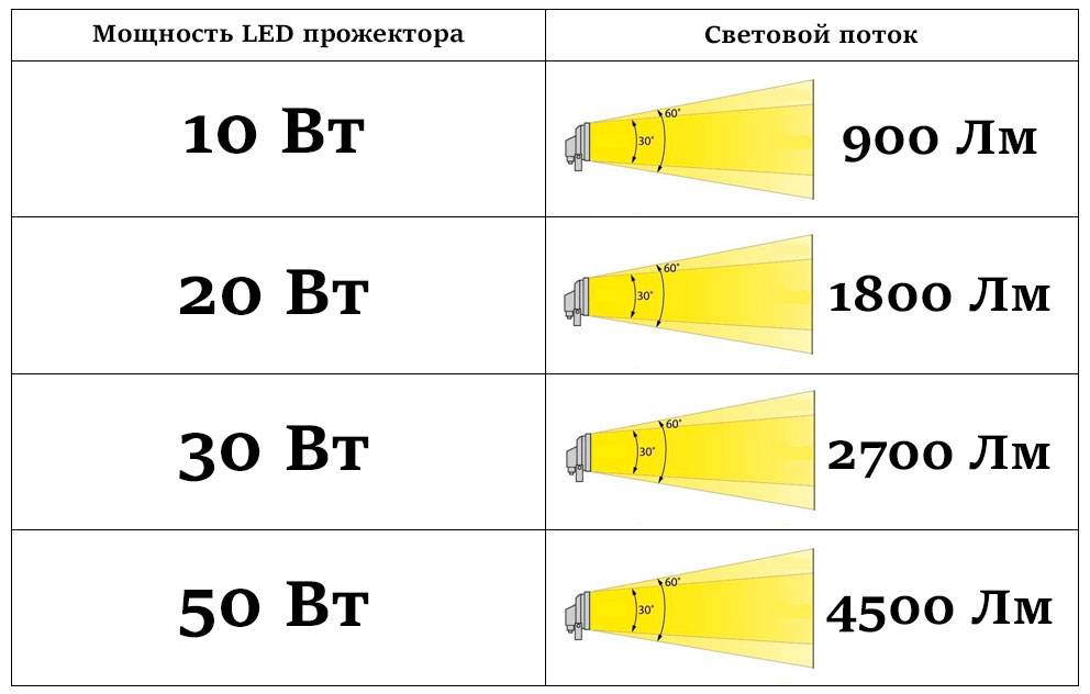 - рассчитать нужную мощность прожектора и площадь покрытия;