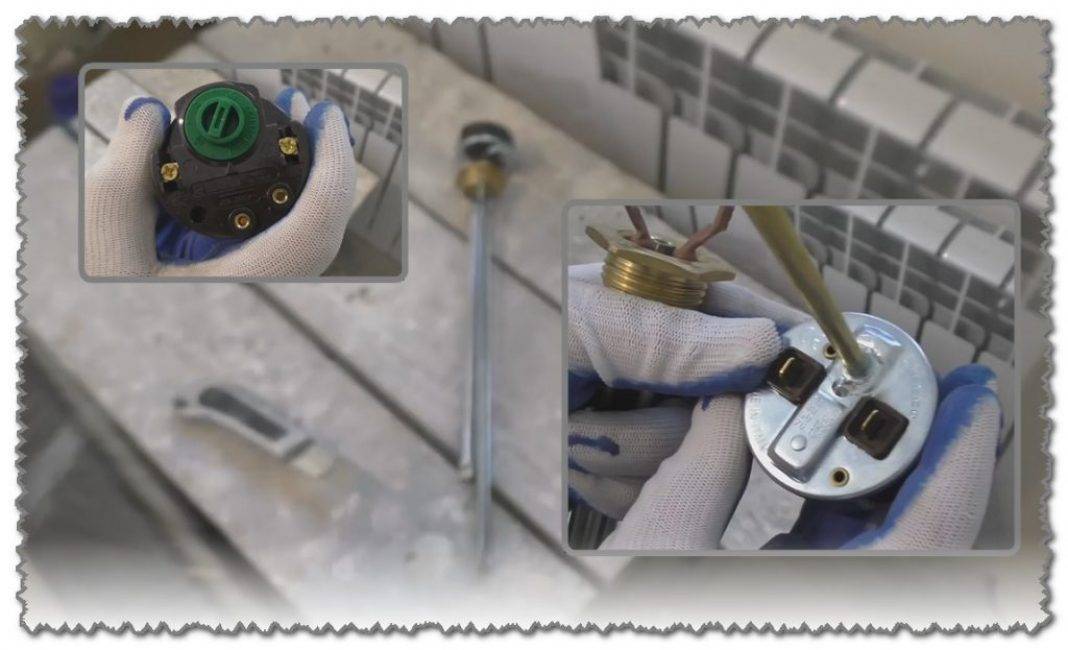 Для монтирования ТЭНа кроме силиконовой уплотнительной прокладки больше ничего не понадобиться, поэтому снимаем с электроприбора термореле и устанавливаем в нижний коллектор радиатора.