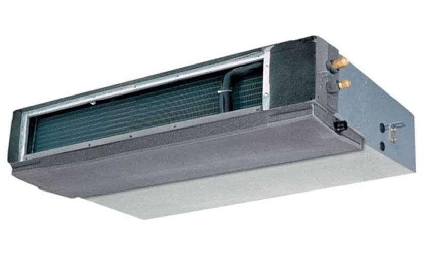 - Канальные. Полностью скрываются подвесным потолком, а распределение воздуха происходит за счёт специально сконструированных воздухопроводов, благодаря чему можно в систему кондиционирования включить сразу несколько помещений.