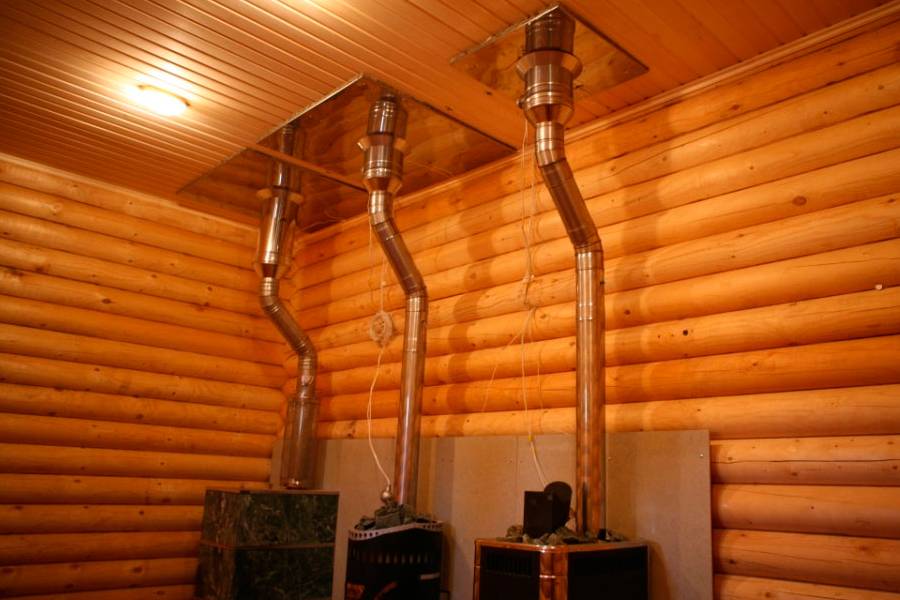 Поскольку дымоходы бывают двух типов, то их монтаж отличается. Когда трубу размещают внутри банной постройки, то практически вся конструкция располагается вертикально. Установку из отдельных элементов выполняют таким образом, чтобы каждая выше расположенная деталь была помещена на находящуюся ниже. Этот способ называется монтажом «по дыму».