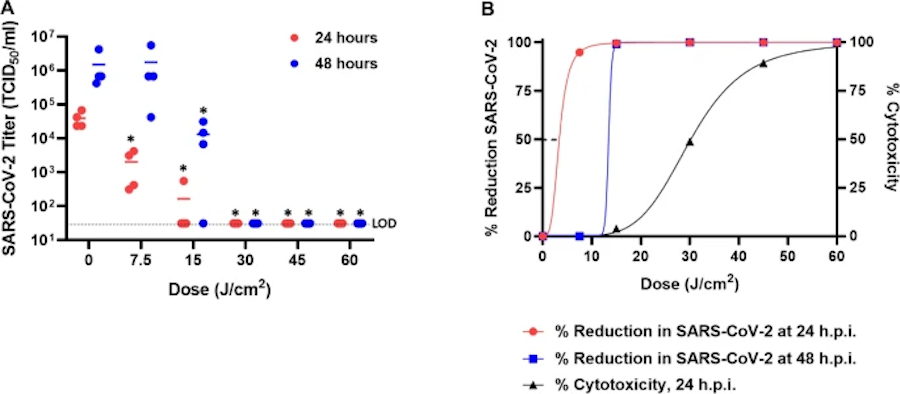 На втором этапе исследователи обработали светом клетки Vero E6, зараженные тремя типами вирусов: коронавирусом SARS-CoV-2, вирусом SARS-CoV-1 («атипичная пневмония») и вирусом MERS (ближневосточный респираторный синдром). В результате облучения способность вирусов к распространению снизилась. Чтобы остановить распространение коронавируса на 99%, было достаточно слабой мощности воздействия. Пяти минут излучения хватило на 24 часа. При этом свет не повредил донорские клетки.