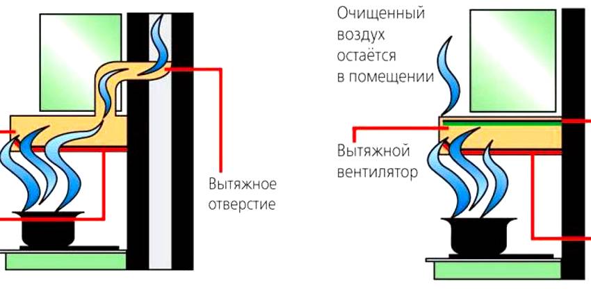 Циркуляционные (рециркуляционные) модели вытяжек отличаются тем, что им не требуется вывод в вентиляцию при помощи воздуховода, потому как поток воздуха очищается, проходя через две очистительные ступени. В вытяжках для кухни с угольным фильтром загрязненный воздух проходит сначала через антижировой, а потом уже через угольный фильтр, после чего он вновь возвращается в помещение.